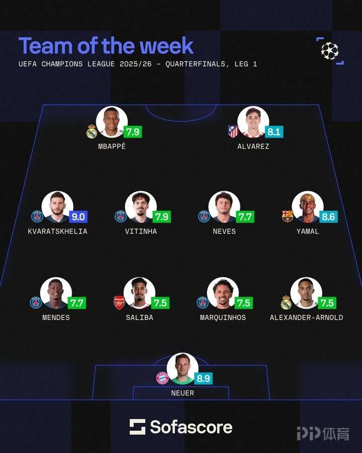 欧冠八强战首回合已经完赛,sofascore也列出了本轮评分最佳阵容,巴黎5将在列。