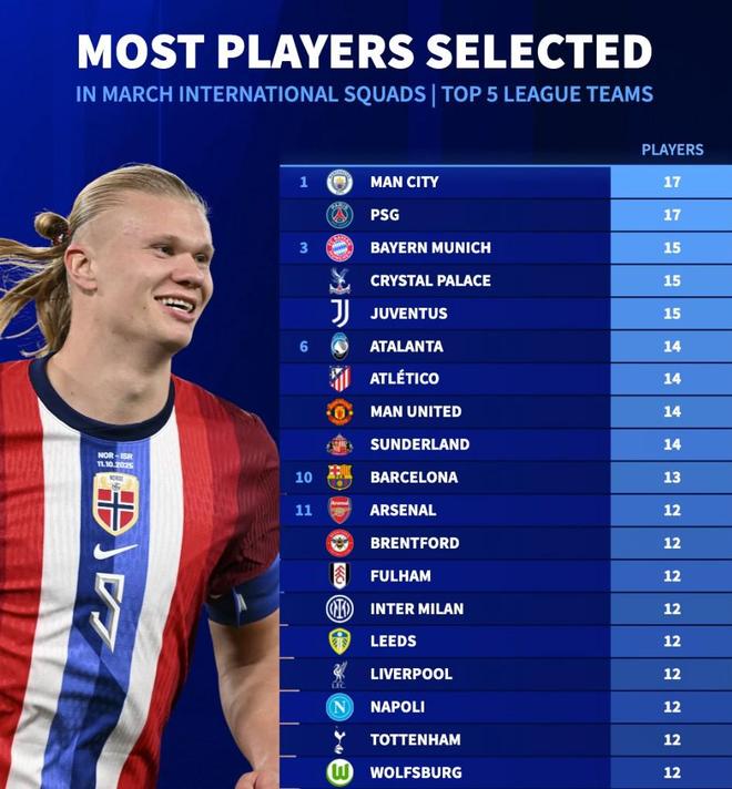 北京时间3月26日,德转列出了本月国际比赛日欧洲五大联赛球队被征召国脚数量,曼城和巴黎圣日耳曼同以17人并列第一,拜仁慕尼黑、水晶宫和尤文图斯15人并列第三。